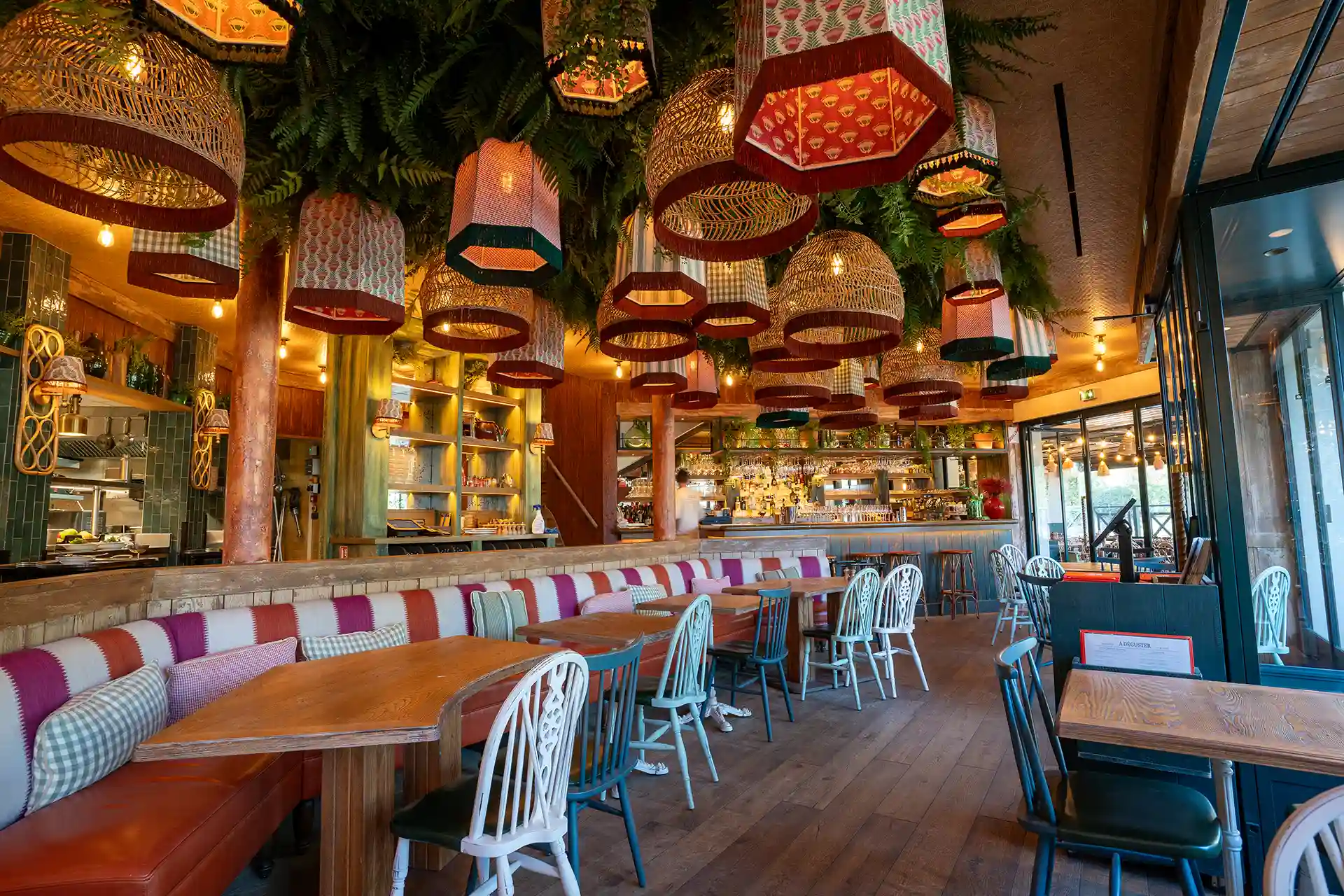 Aménagement du restaurant Le Cœur Joie, un espace où convivialité et cuisine généreuse se rencontrent, avec des tables rapprochées et une ambiance joyeuse et décontractée.