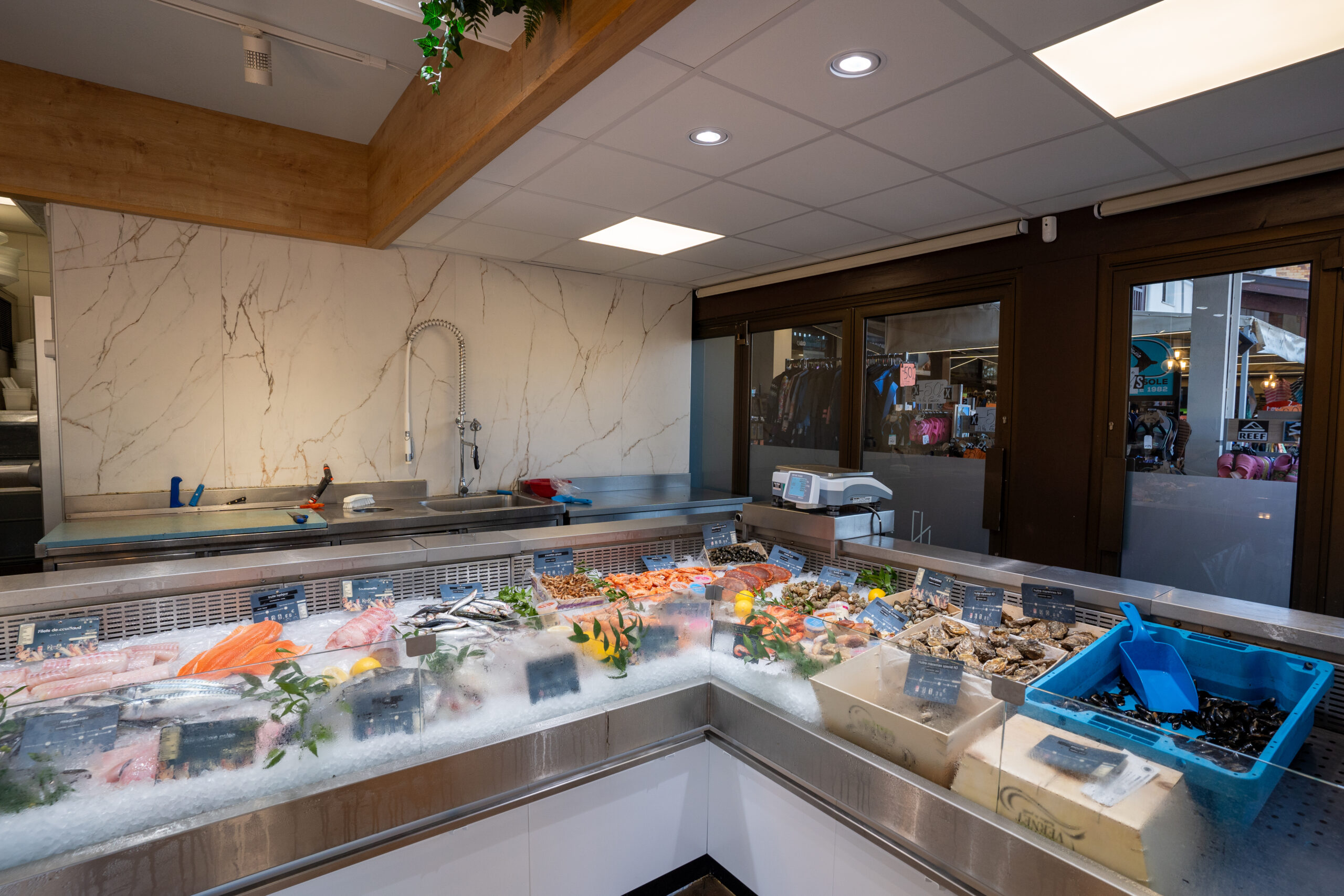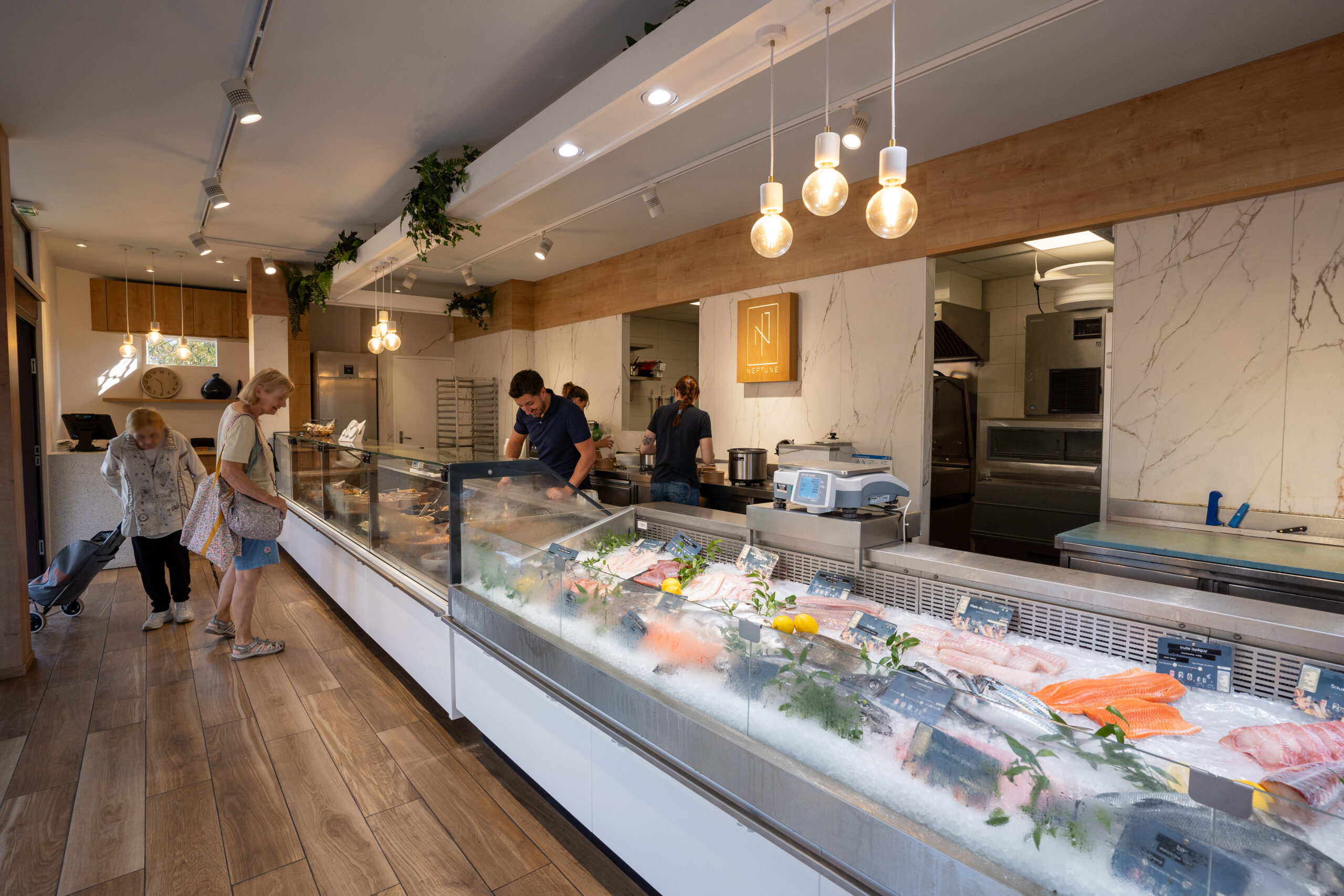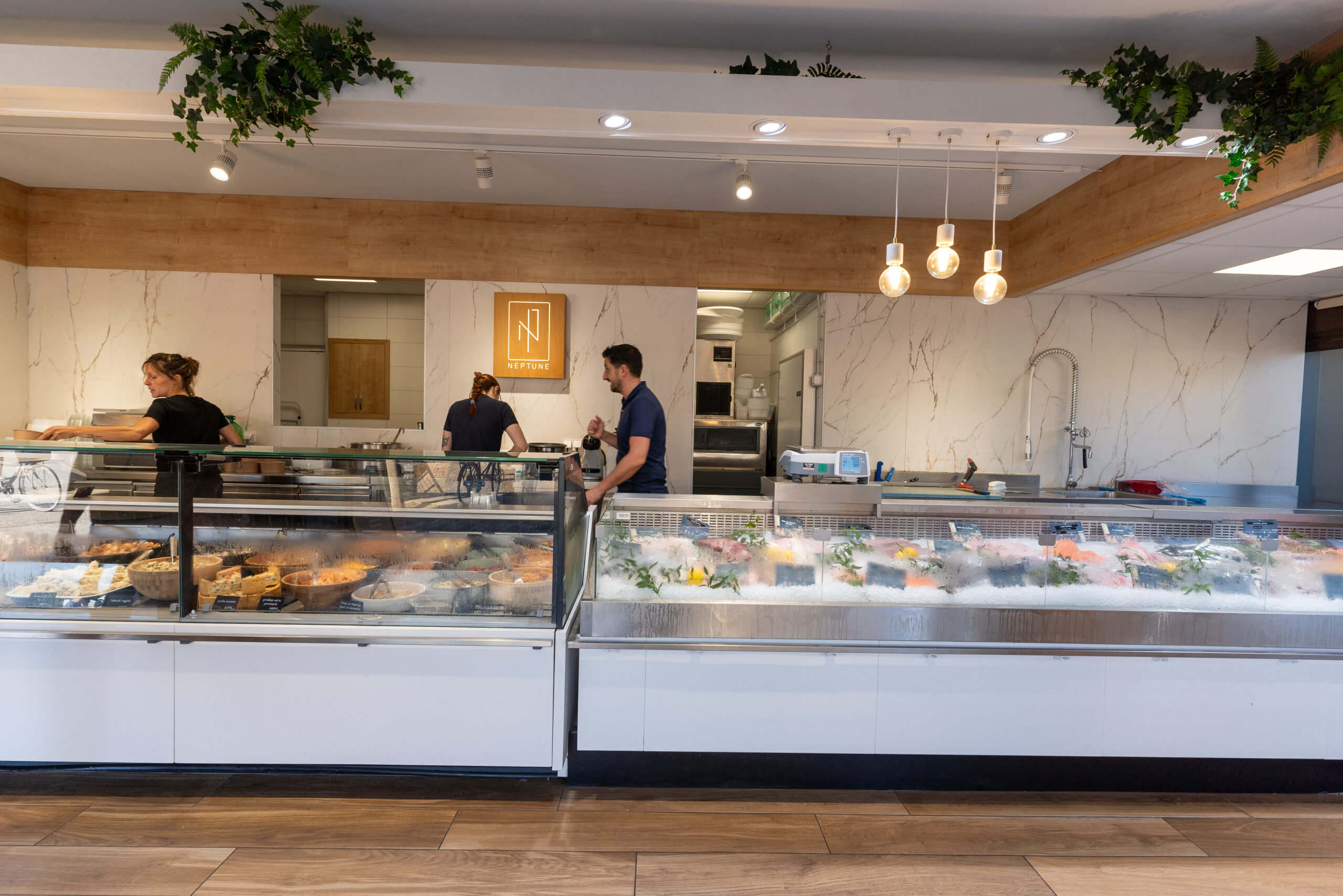 Aménagement de la Poissonnerie Neptune avec un décor lumineux et moderne, mettant en valeur les produits frais et créant un espace accueillant pour les clients.