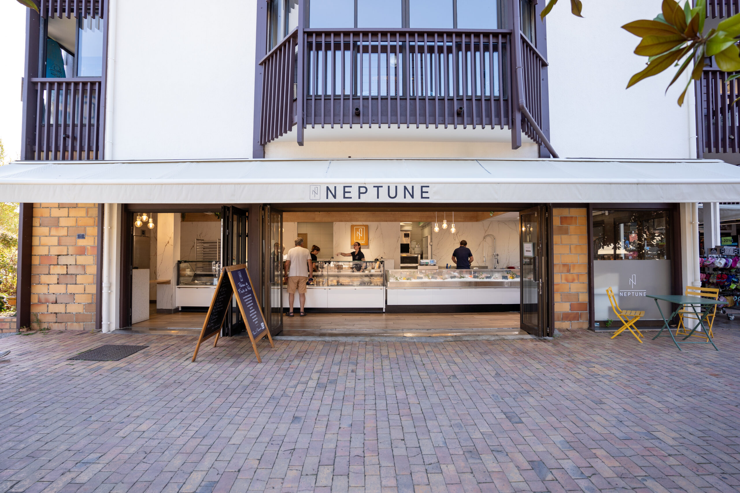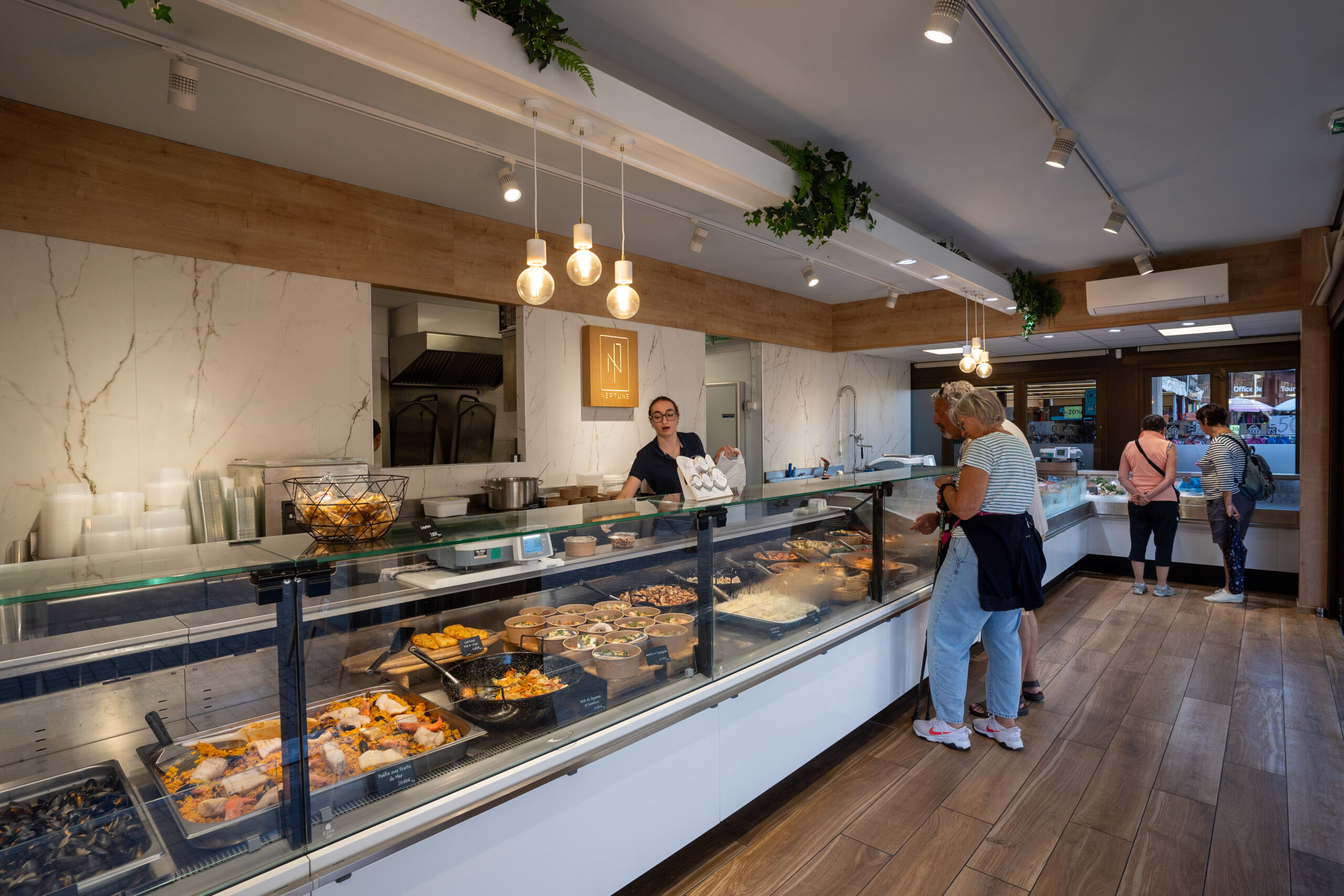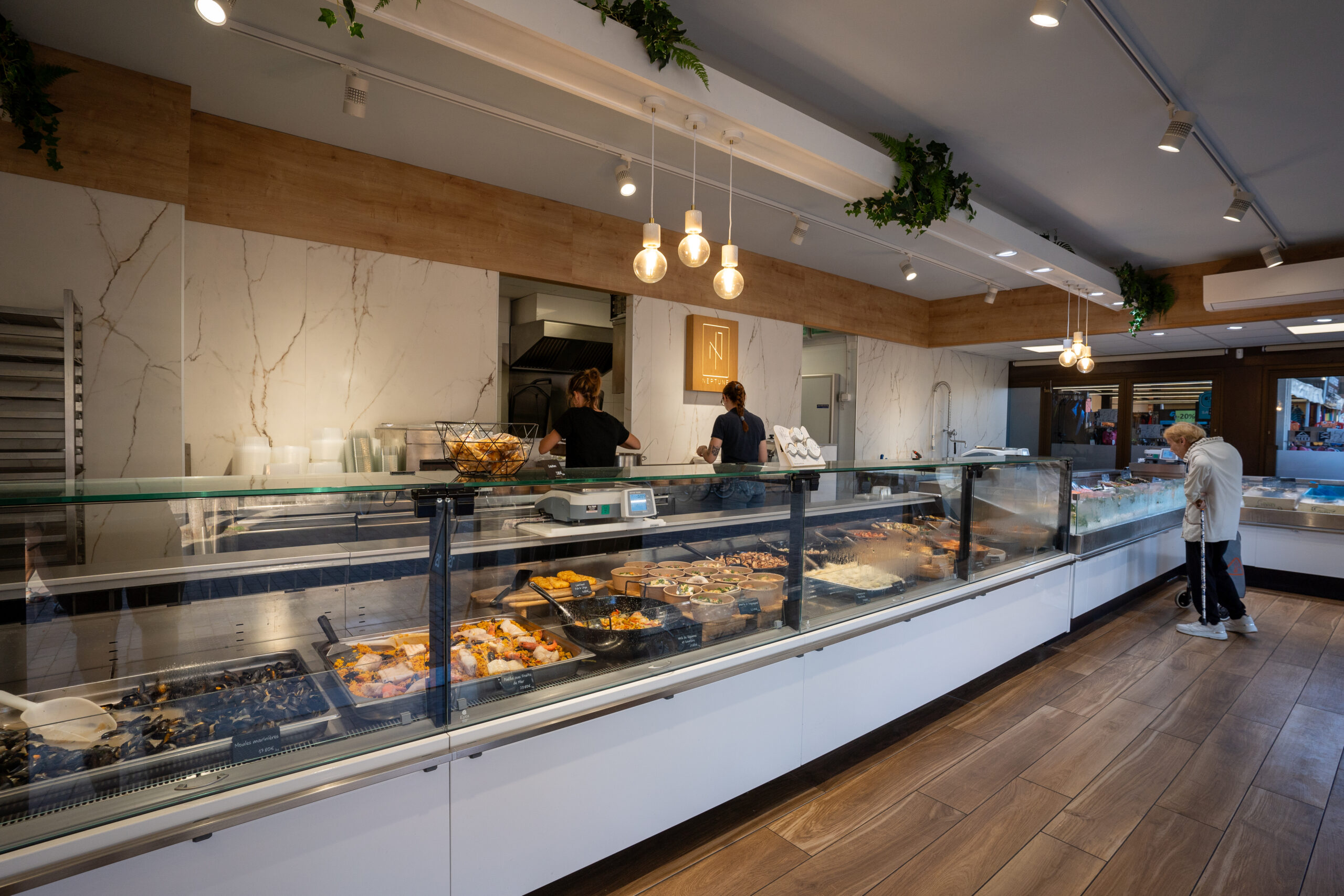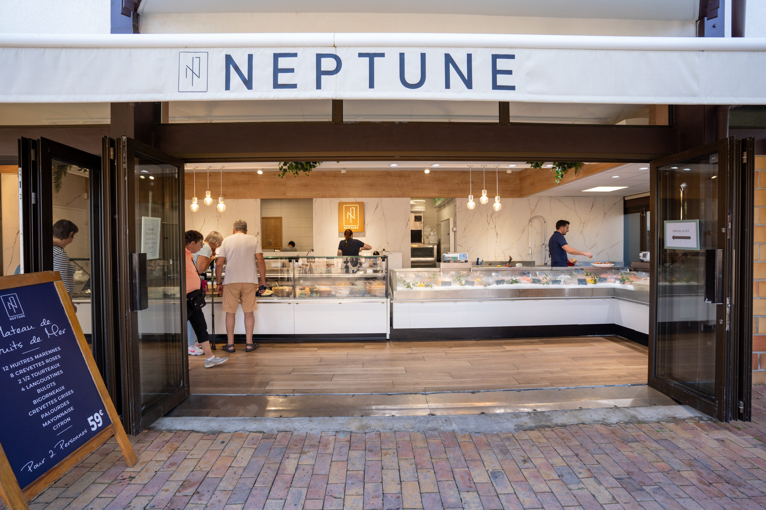 Aménagement de la Poissonnerie Neptune avec un décor lumineux et moderne, mettant en valeur les produits frais et créant un espace accueillant pour les clients.